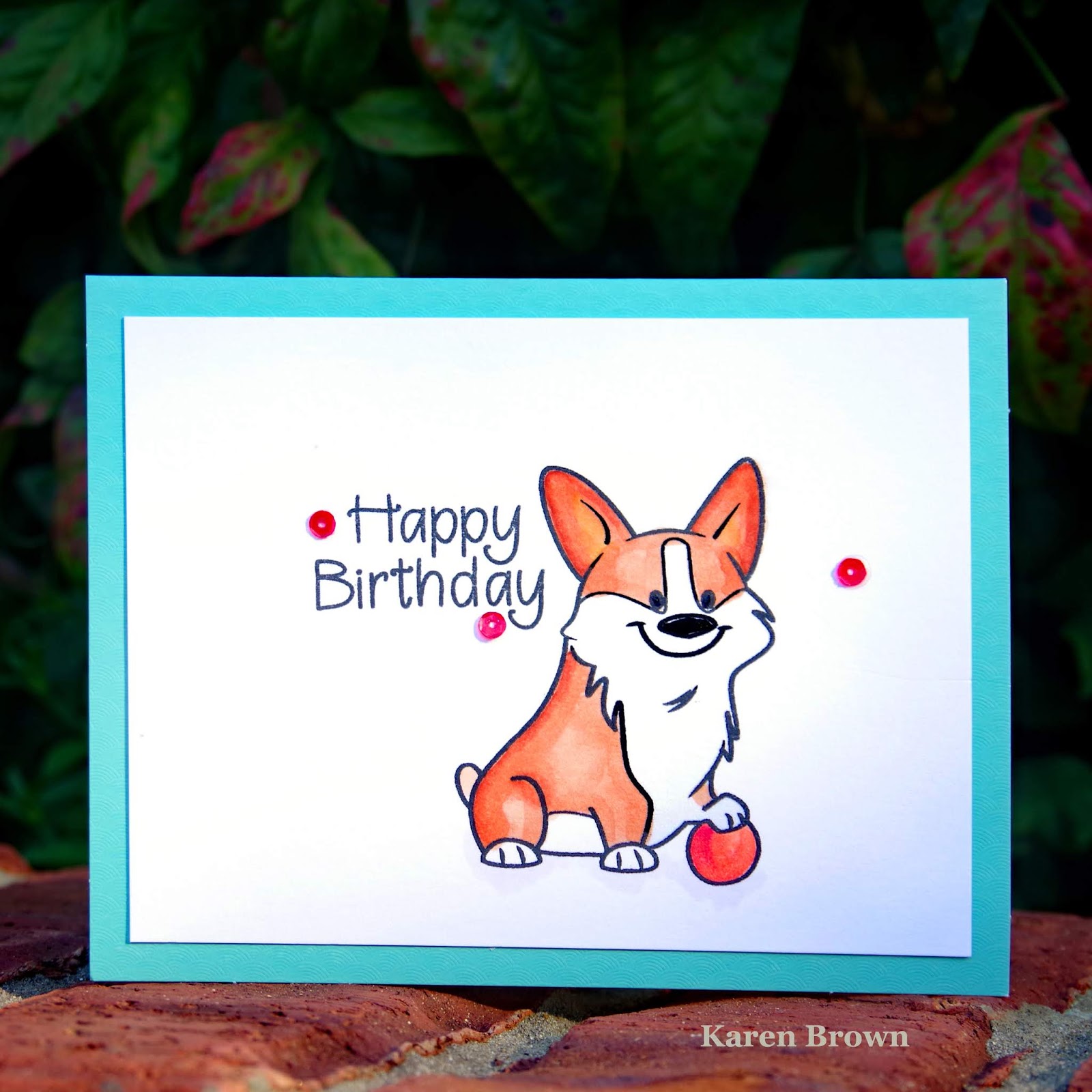 The stamp set is Corgi2stamp from Stamps of Life.  I made four versions of this card, but this one is colored with Copic markers and embellished with cheerful red sequins.