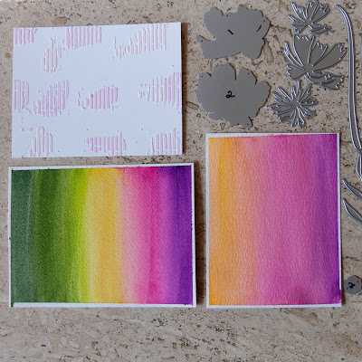 On two panels of watercolor paper,  I brushed on bold watercolors from the 36 pan set.  I dried the panels and added a second layer so I had really saturated color.  Here is a photo of the three panels I used to make this card.