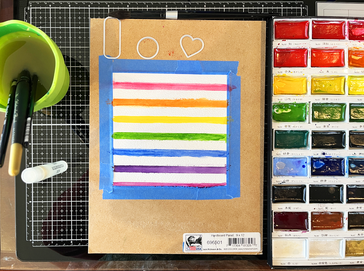 I stamped the Wide Stripe Background Stamp onto watercolor paper using Unicorn White Pigment Ink, then heat embossed it with white embossing powder. I knew I wanted to watercolor in between the embossed stripes, so I taped my panel to a hardboard to help minimize warping—always a helpful step when working with lots of water.