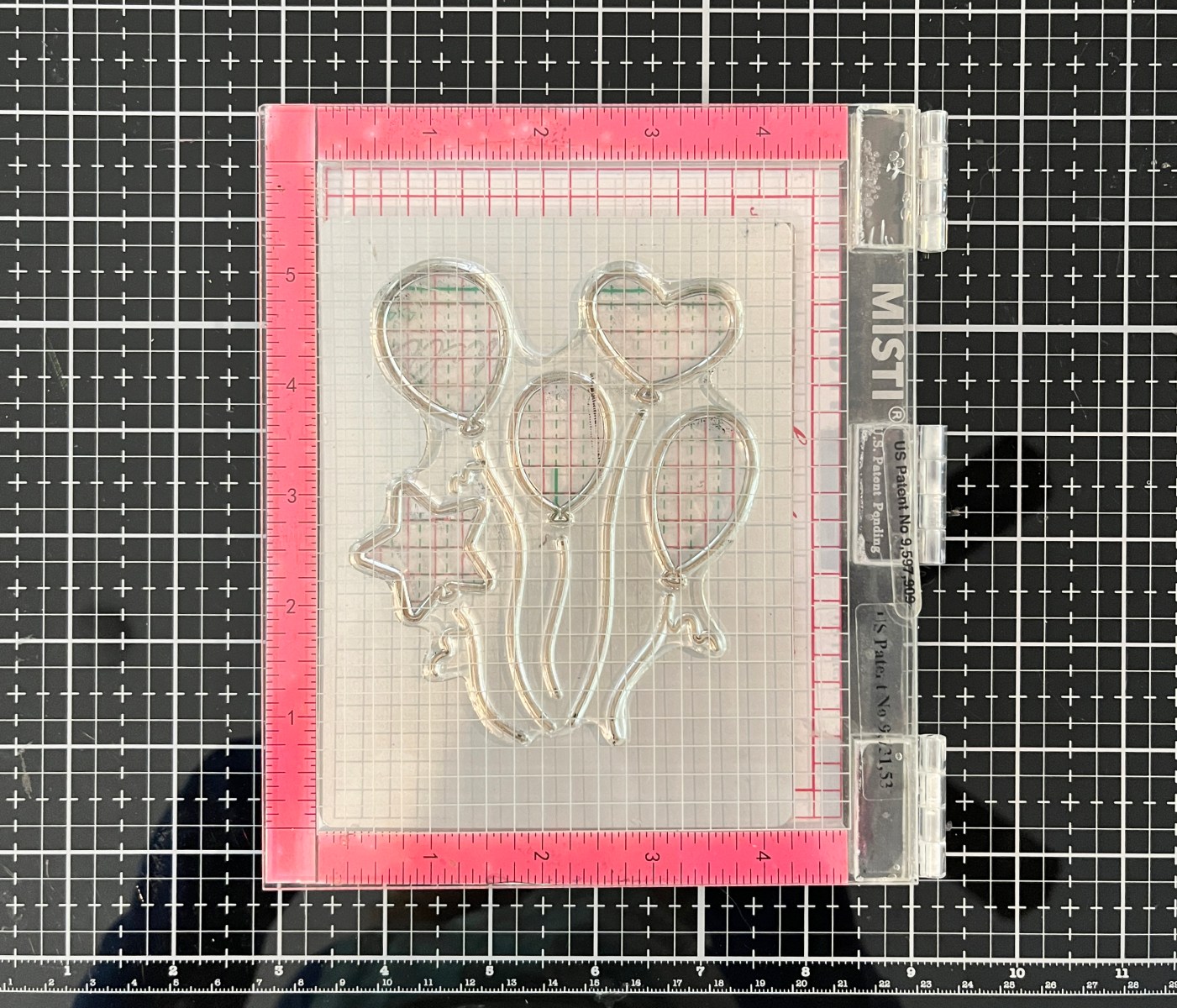 I started by placing the cover plate die in my stamp positioner and aligning the large balloon stamp (a cluster of five balloons) over the die. Once perfectly placed, I closed the lid so the stamp was now on the positioner lid, removed the die, and was ready to stamp and die cut with precision. There is a process photo below.