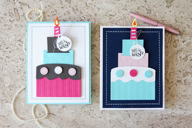 Don\’t you just love that cute little \”Make a Wish\” tag? The tag is part of the layer cake die set and the companion sentiments fit perfectly on the tag.  The navy interactive card was assembled with liquid glue, the other three were assembled with foam tape.