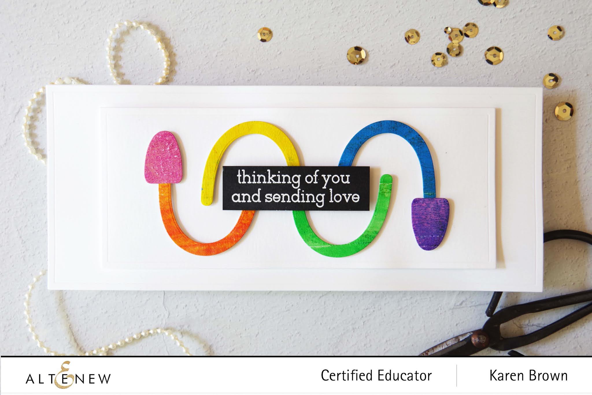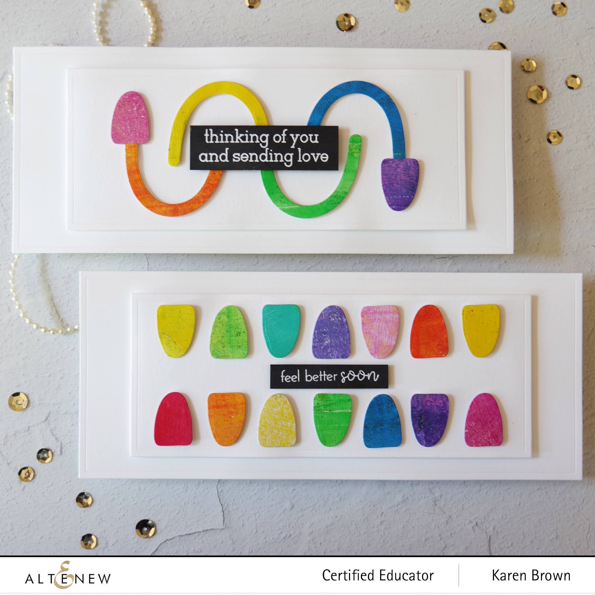 Altenew\’s Color Bands dies are wonderful and at a great price point!  If you like to die-cut there are endless possibilites….I found them so addiciting!  For this first card, I used brightly colored scraps of gel press prints.  My inspiration was gum drops and I die cut 14 rainbow hued \”gum drops\” and adhered them to my card with foam tape.  I crafted my slimline card using the Nesting Slim Rectangles Die Set.