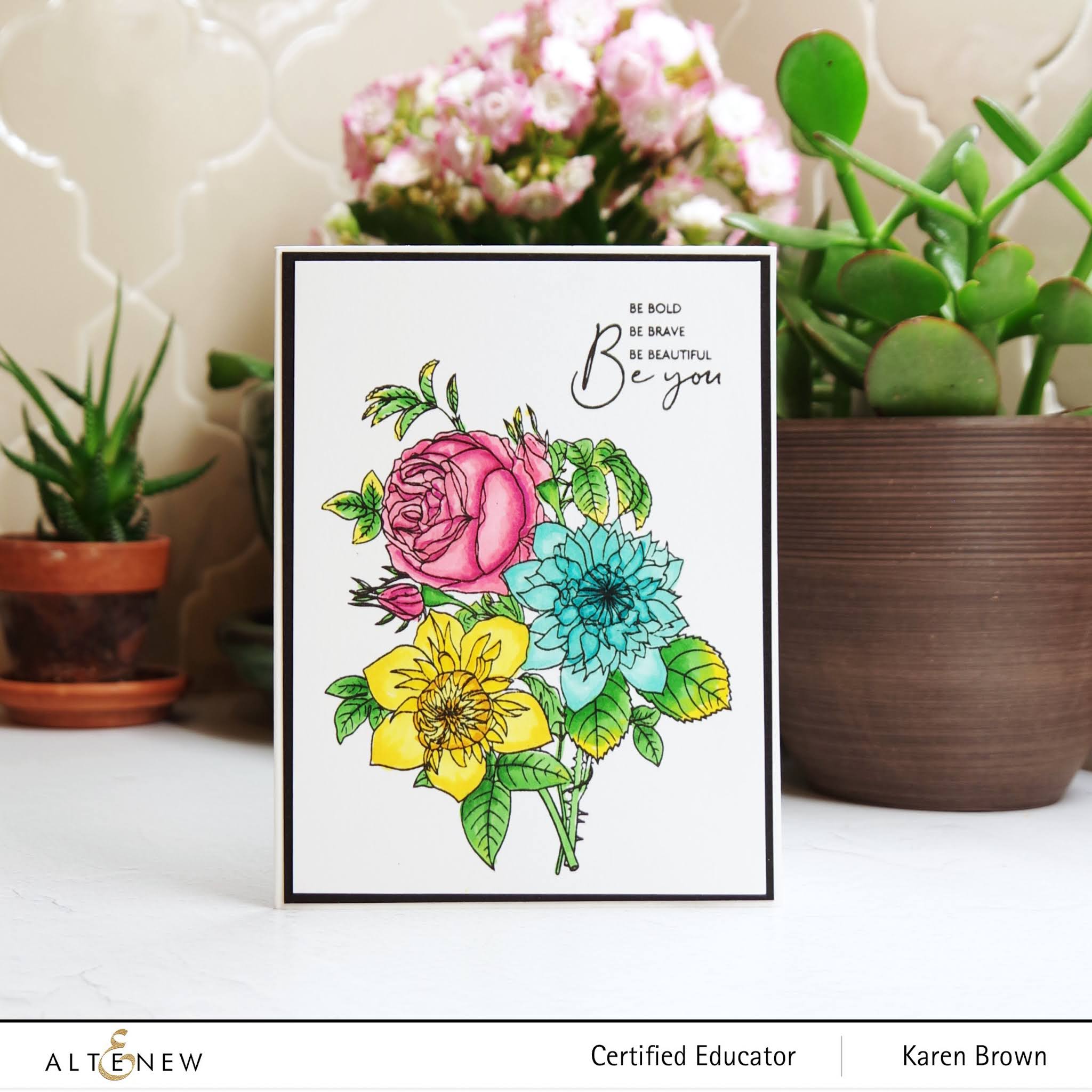 I was in a coloring mood and these flowers are so fun to color!  I used Altenew\’s  Artist Markers Set F (Sunshine Valley Garden) and Set G (Water Garden).  The kit has a bunch of wonderful sentiments and I selected Be Bold…