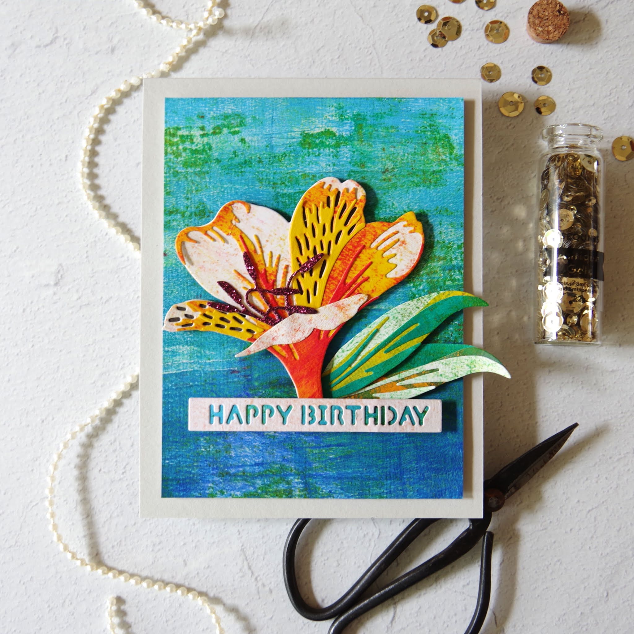 Recently, I spent a fun day making Acrylic Gel Press Monoprints and thought it would be fun to die-cut some of the images and make a few high contrast colorful birthday cards.  I used my favorite Altenew Craft-A-Flower kit, Cosmos Layering Dies for each of my projects.