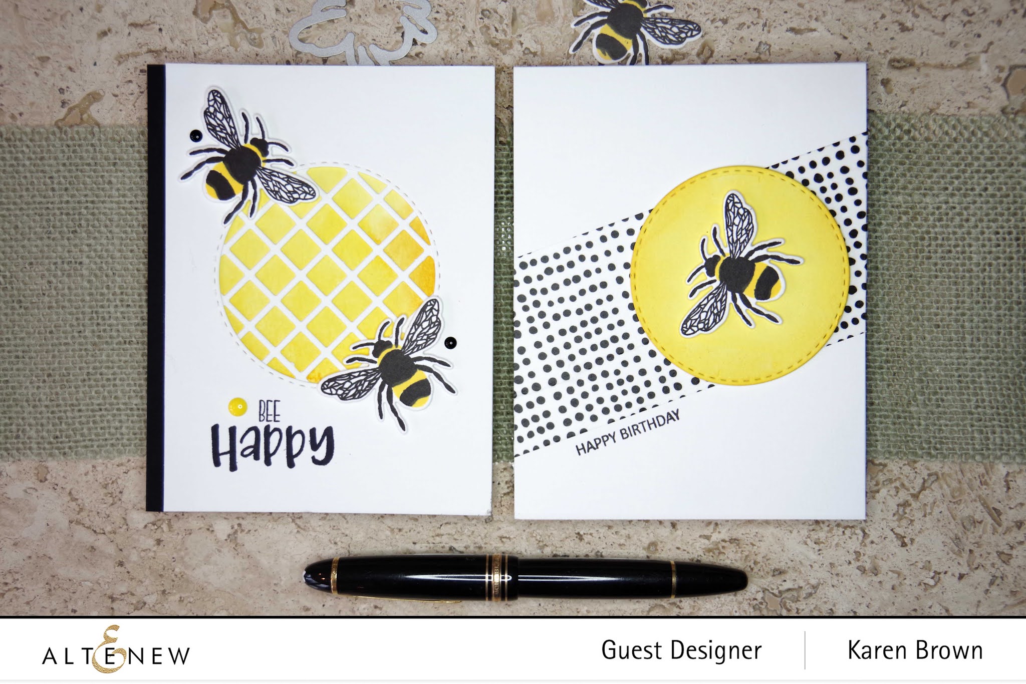 To set the scene, I used a The GardenTrellis Cover Die cut over a watercolor panel that I painted using The 36 Pan Watercolor Set. I gently blended Warm Sunshine with a bit of Paper Bag for depth and variation. I added one yellow and two black enamel dots from the New Day set to complete the card.