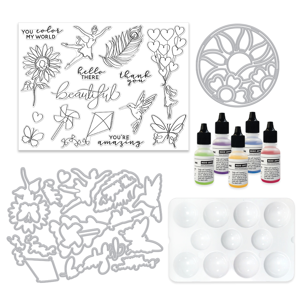 • Clear Stamp Set, 6” x 8” • 15 Coordinating Dies • Floral Circle Fancy Die • 5 Reinkers, 1/2 oz. (Purple Galaxy, Blue Hawaii, Green Apple, Lemon Drop, Fruit Punch) • Plastic Watercolor Palette