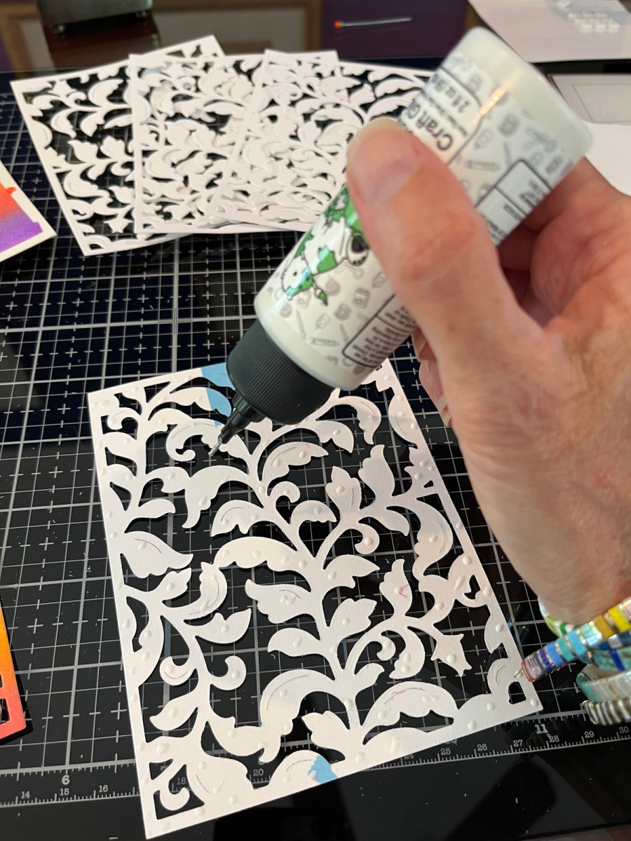- In rainbow order, I rotated around the Floral Trove stencil, starting in the top left hand corner with Amethyst. I went left to right, dropped down a row and went right to left, dropped a row and finished going left to right again.