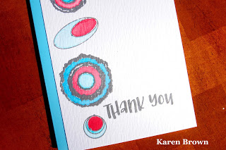 I am trying to stay ahead so I began creating my holiday thank you notes. The idea for this card came to me over several days. I won a challenge this summer and the prize was a gift certificate to Visible Images. I selected several stamp sets and thought it would be fun to do a modern card using some of the circles and spheres that came in the sets. Aqua and red are perfect for this time of year.