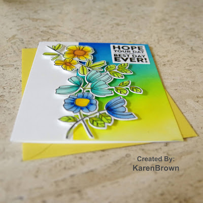 - Sentiment: A die-cut, scripty “hello” (Friend Words Sentiment Dies) that complements the vintage theme. Two black enamel dots in the center of the flowers continues the bold color palette.