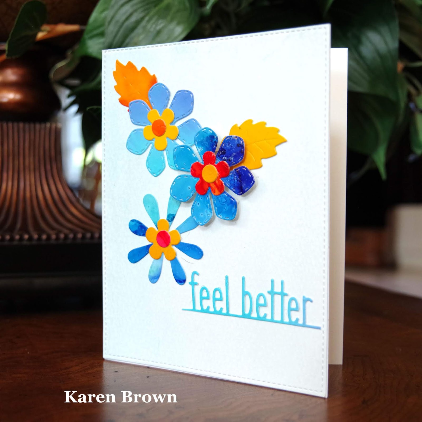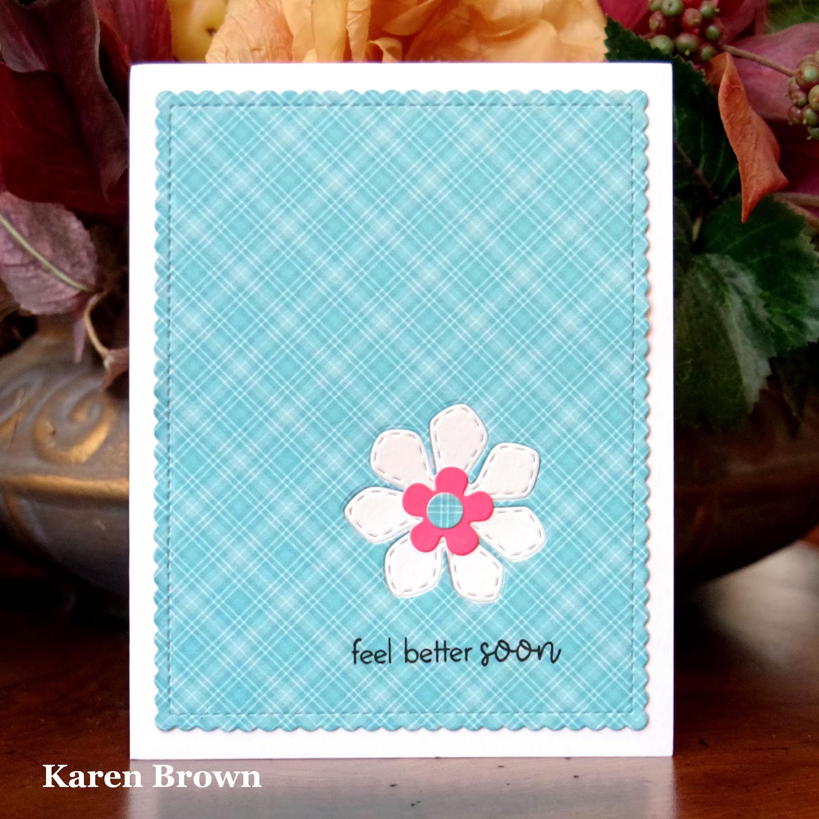 I created a cheerful Get Well card with the Small Die of the Month (Outlined Christmas Sentiments) kit. I love the ten mix and match sentiments (and shadows): Merry, Greetings, Warm, Christmas, Holiday, Wishes, Cheer, Enclosed, Joyous, Hugs.