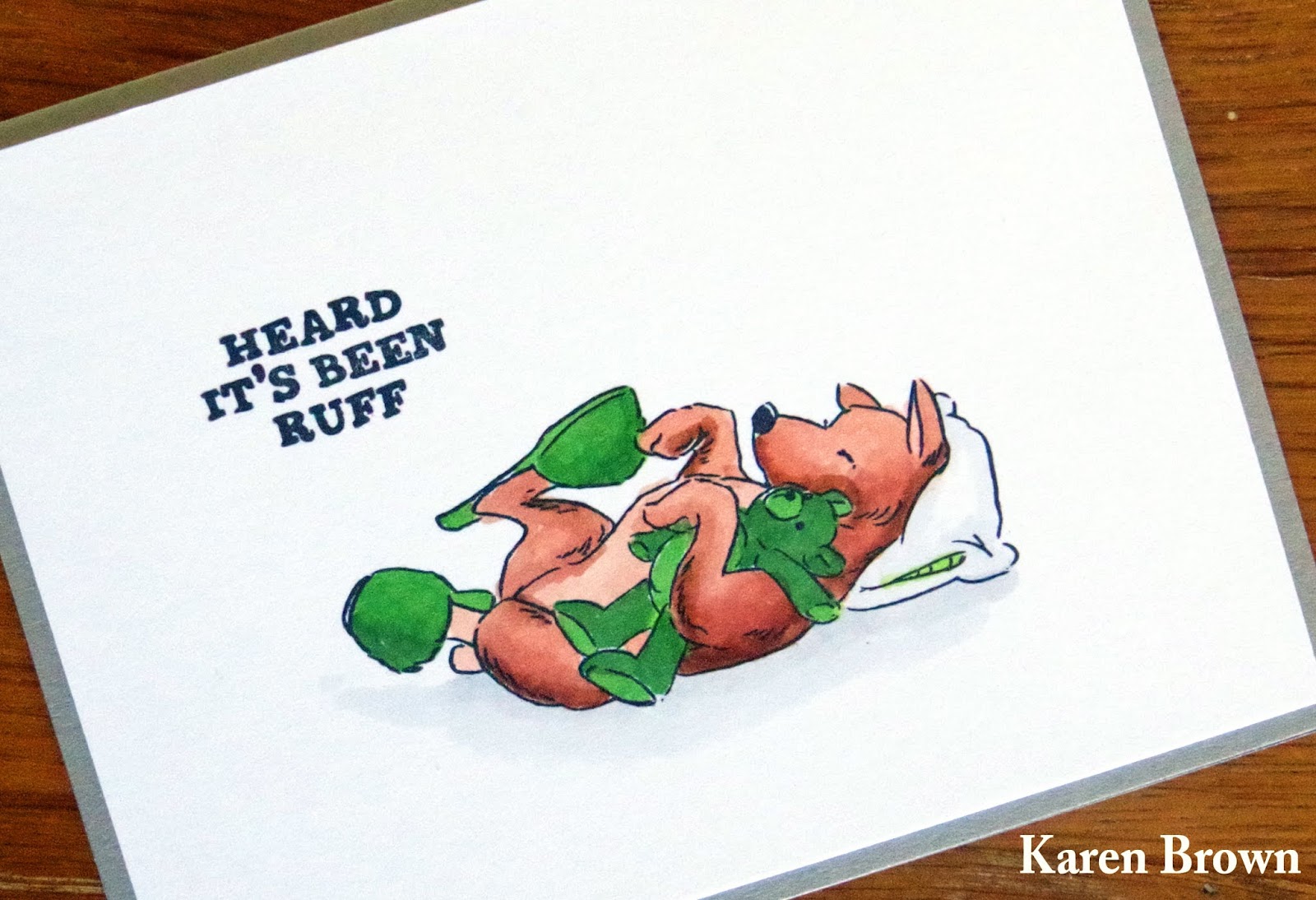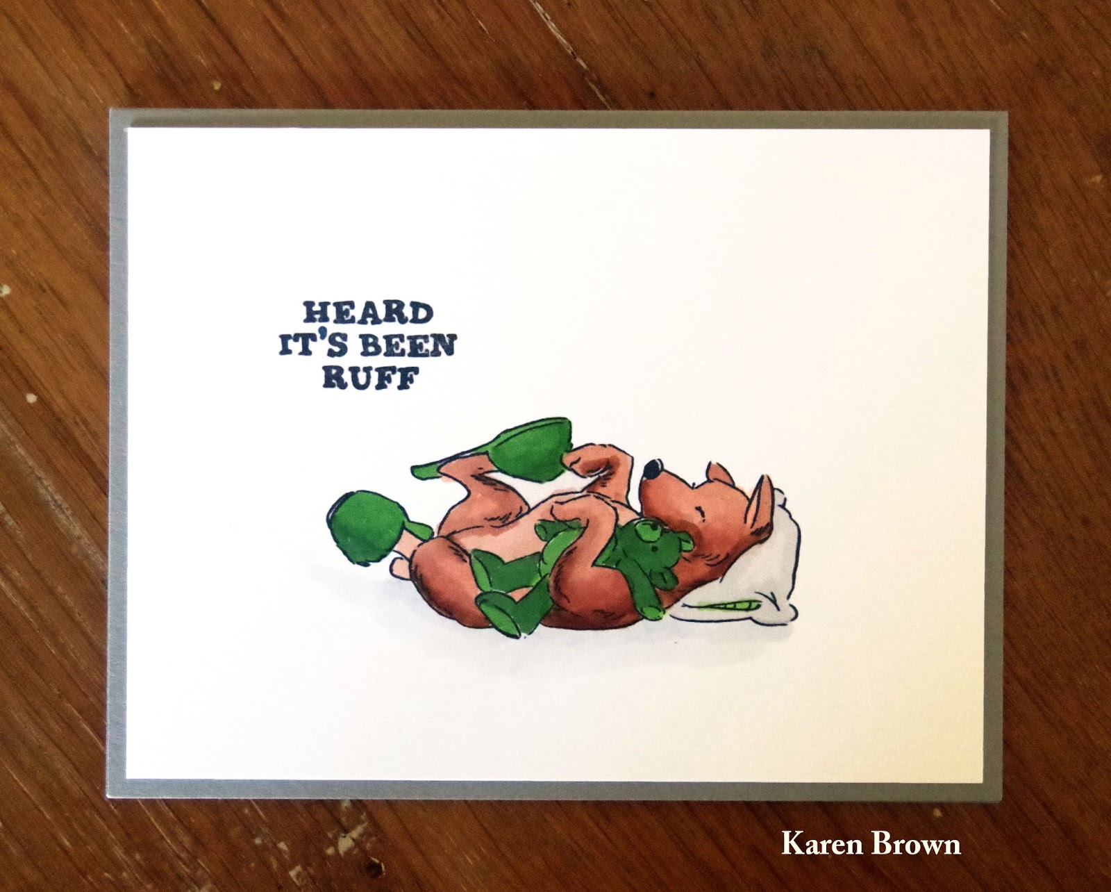 The dog is from one of my go to stamp sets for Get Well Cards- Art Impressions Doggy Kisses. I colored the pup with copic markers, added a bit of shadow underneath the dog and mounted on a gray A2 card.
