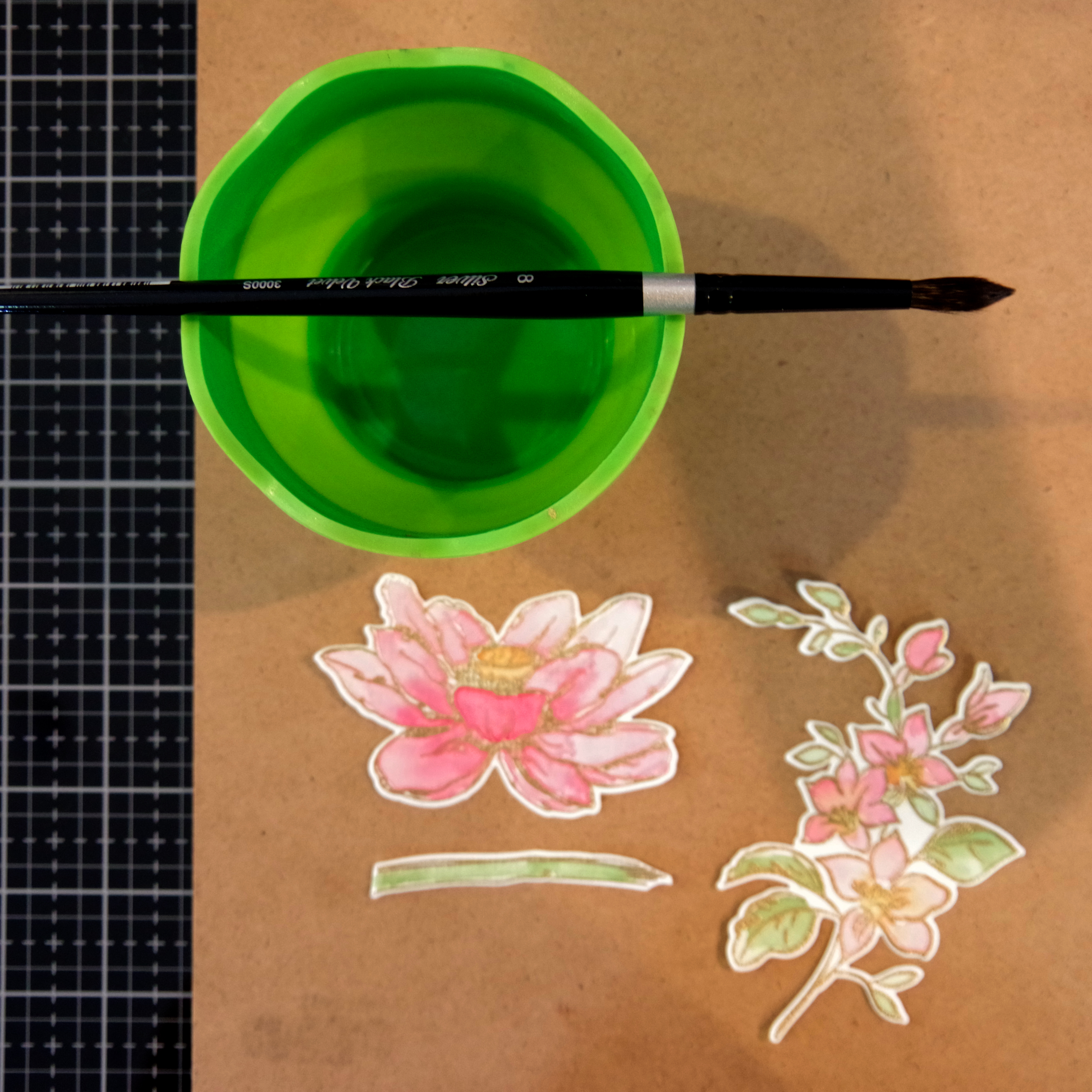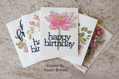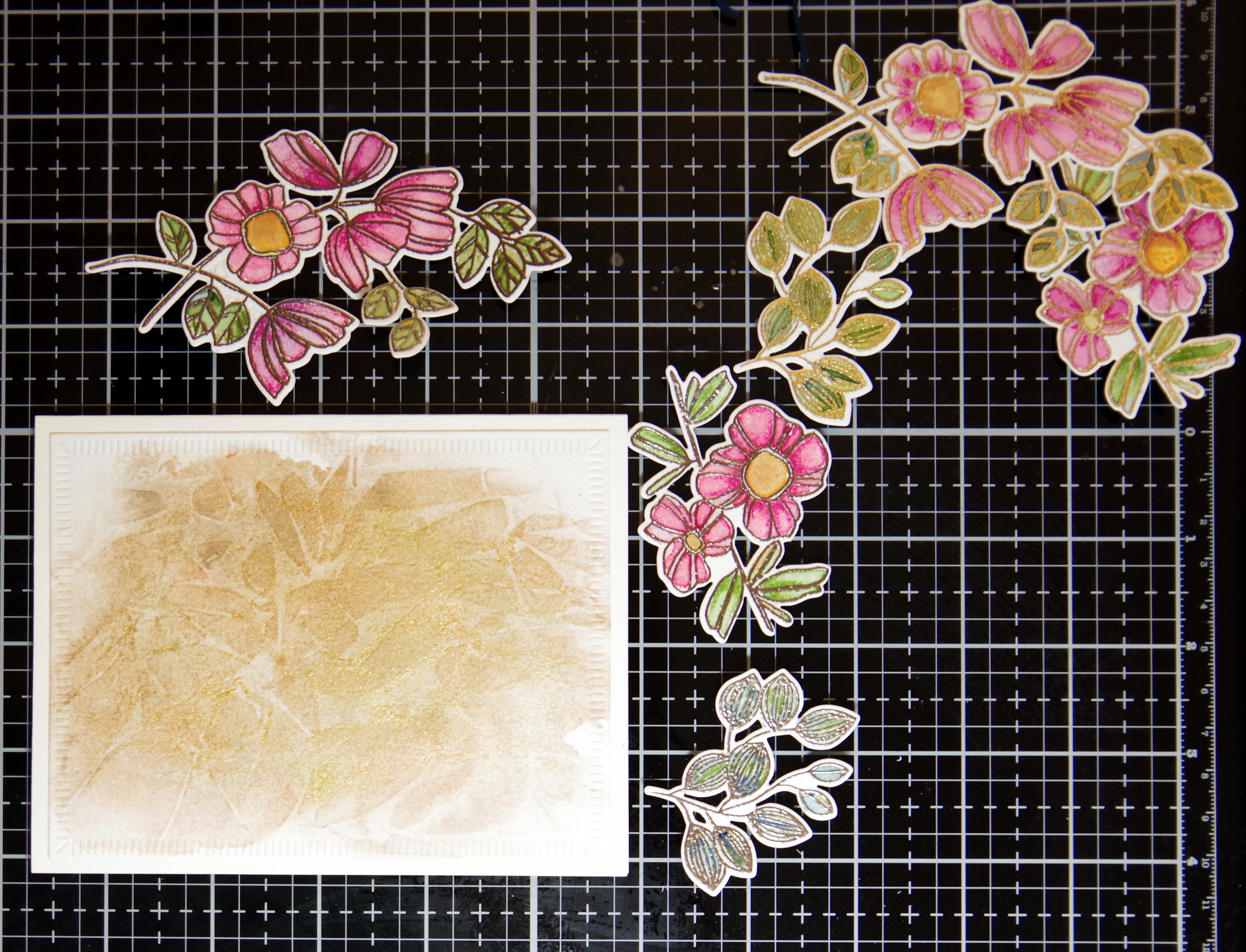 For this first card, I created a metallic watercolor background which is so pretty in person. I then stamped, heat embossed and watercolored the floral images. After the flowers dried I added a pearlescent white gold watercolor wash over the top which gave the flowers a beautiful sheen. I die cut the images and attached with foam tape. The next photo shows the first three card in process.