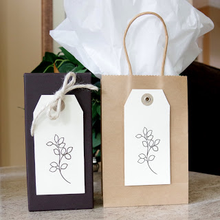 We were challenged to use a recycled element in each set. For the feminine set I recycled a small Kraft gift bag and for the masculine set I re-used an elegant chocolate brown box. I heat embossed some tags to top each set.