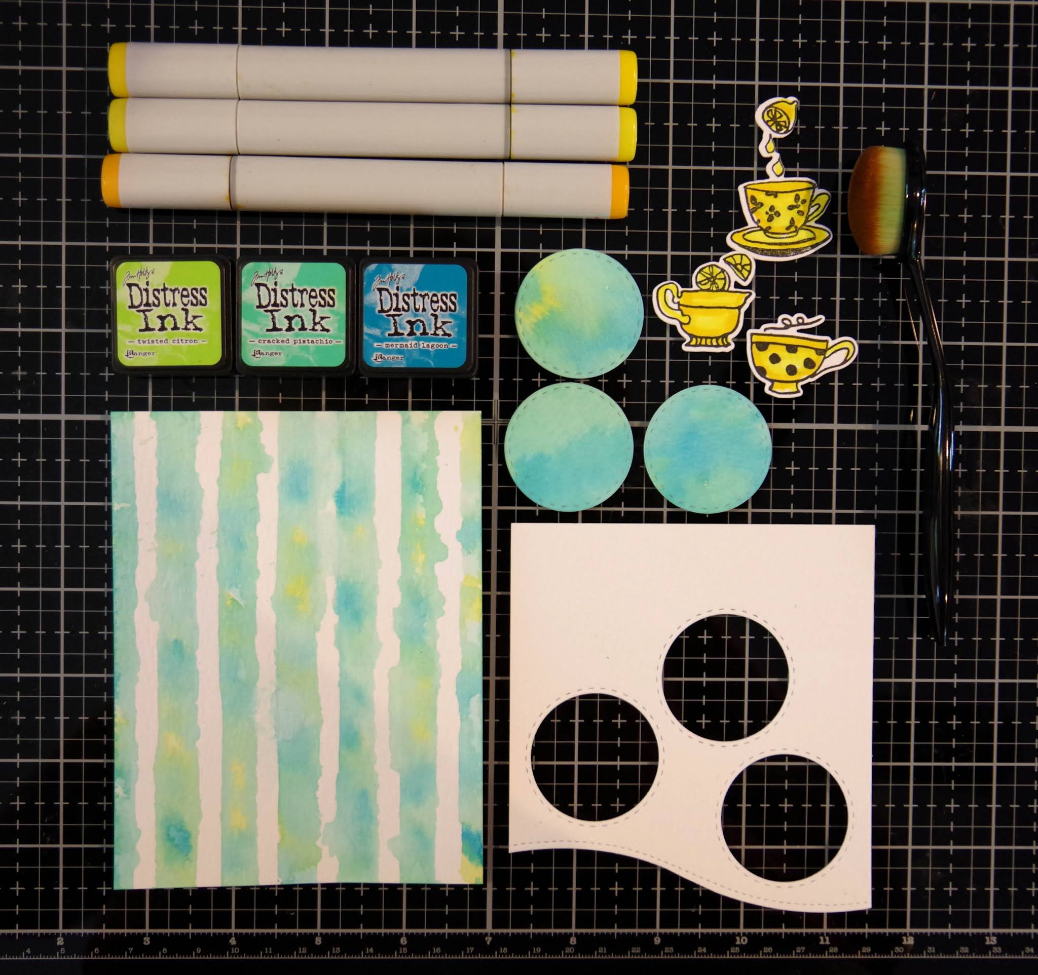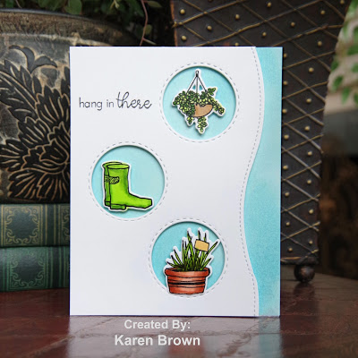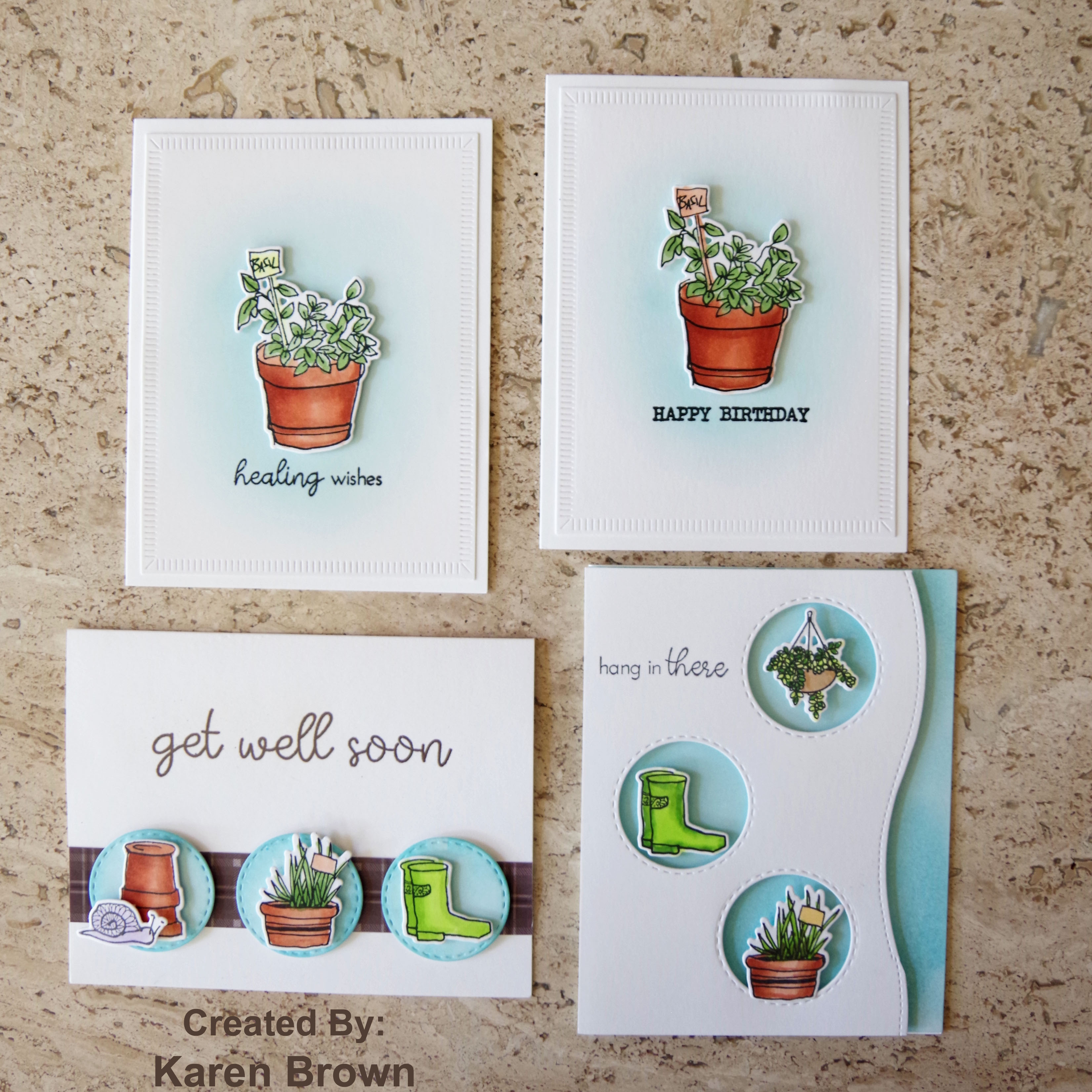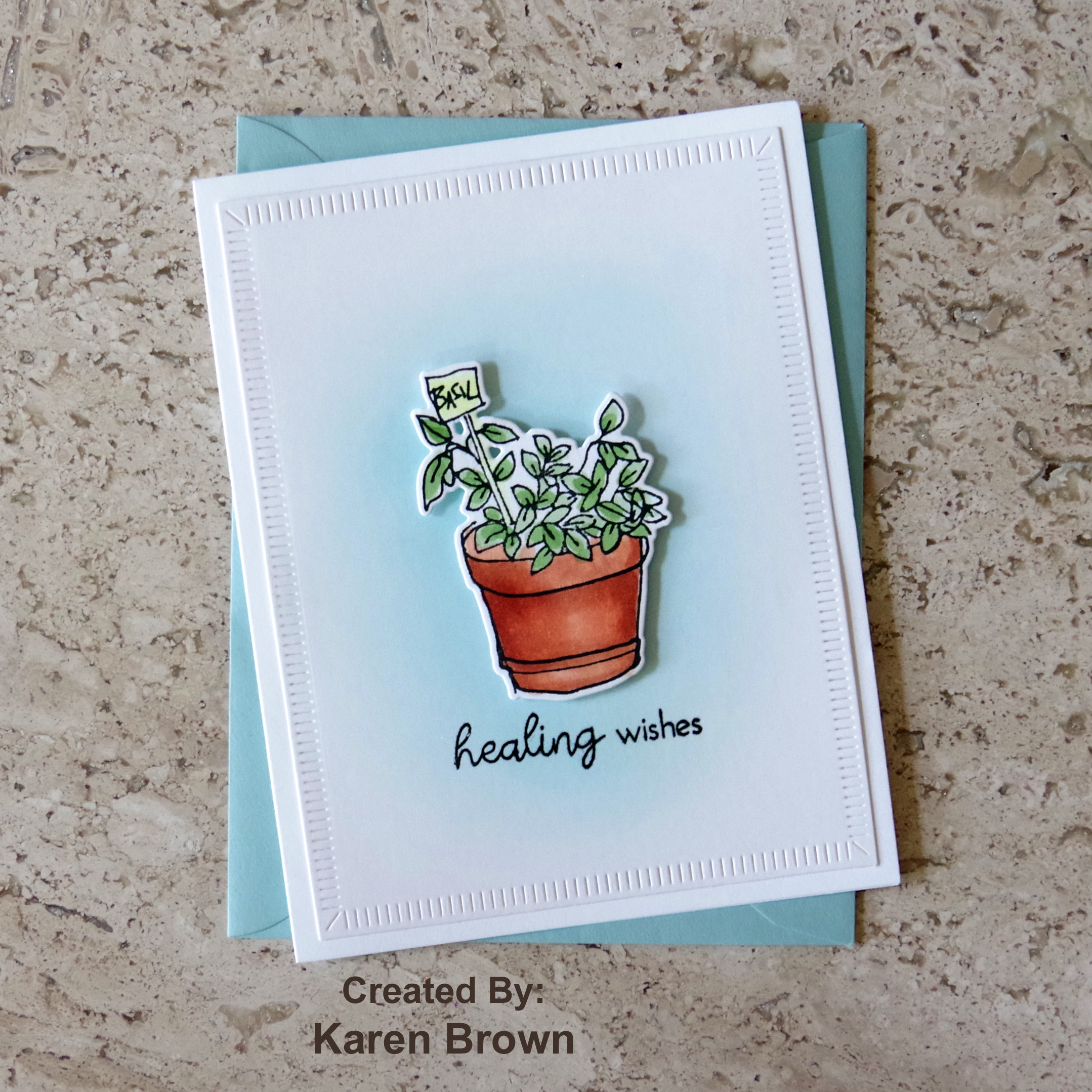 For my \”masculine\” cards I chose to use an overall blue theme with ink blending techniques and Altenew\’s Garden Grow as the unifying elements. For my first card, I ink blended a background and used peek-a-boo die cut windows to spotlight my images. During quarantine, I\’ve been sending so many encouragement cards that I wanted to include one in this set.