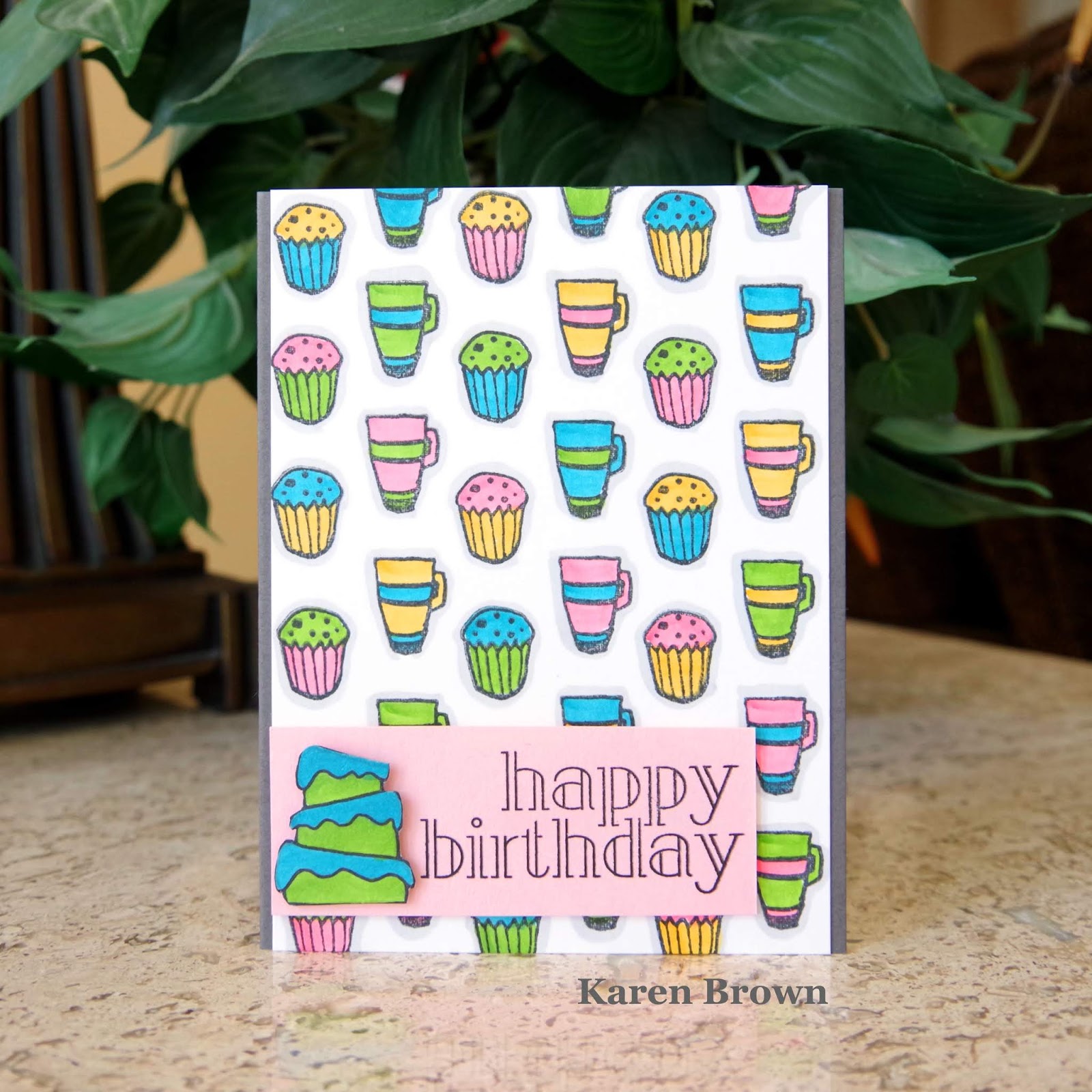 I love the look of linear pattern stamping and think the horizontal (coffee cups) and vertical (cupcakes) stripes emphasizes the  linear look.  I used an acrylic block and grid paper (instead of a Misti) to hand stamp the images (Altenew Tea Time).
