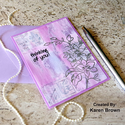 The background from this next card is the top portion of the panel I used on the daisy card above. I die cut it with the largest Rounded Rectangle and then backed with foam for dimension. The Inked Lotus was heat embossed and die cut from a coordinating monoprint panel for a tone-on-tone look and was adhered with foam tape. The sentiment was die-cut from black cardstock using the Essential Sentiments Set.