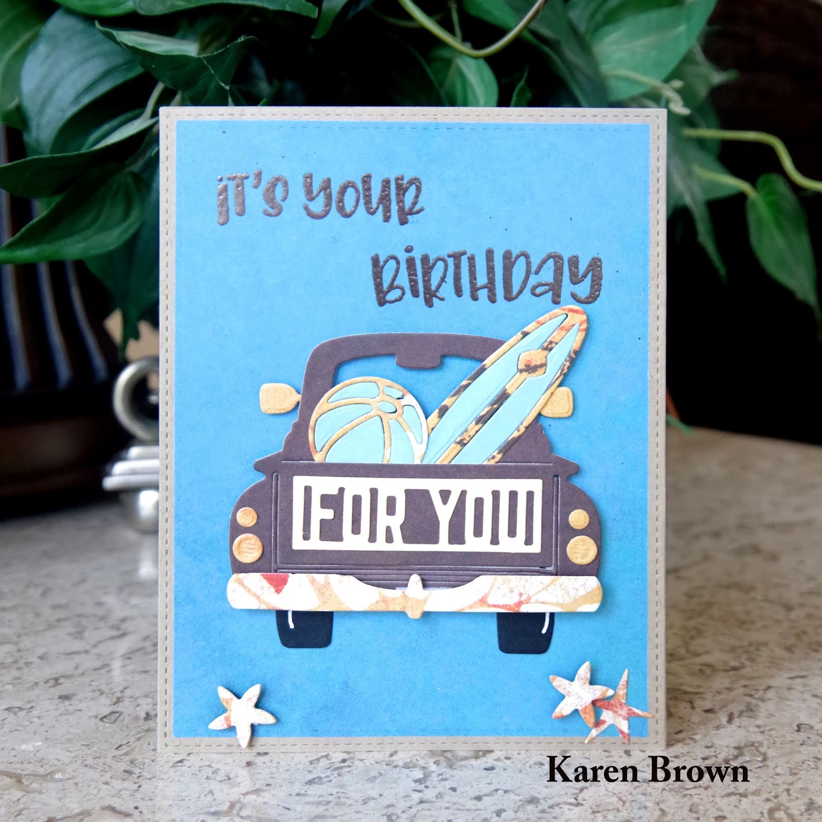 Hello and welcome! This week at The Watercooler Wednesday Challenge we are designing projects for the men in our lives. Kath is our hostess. I created a card for my brother who drives a pickup and is an avid surfer. I love how this die set has beach accessories to fill the truck bed.