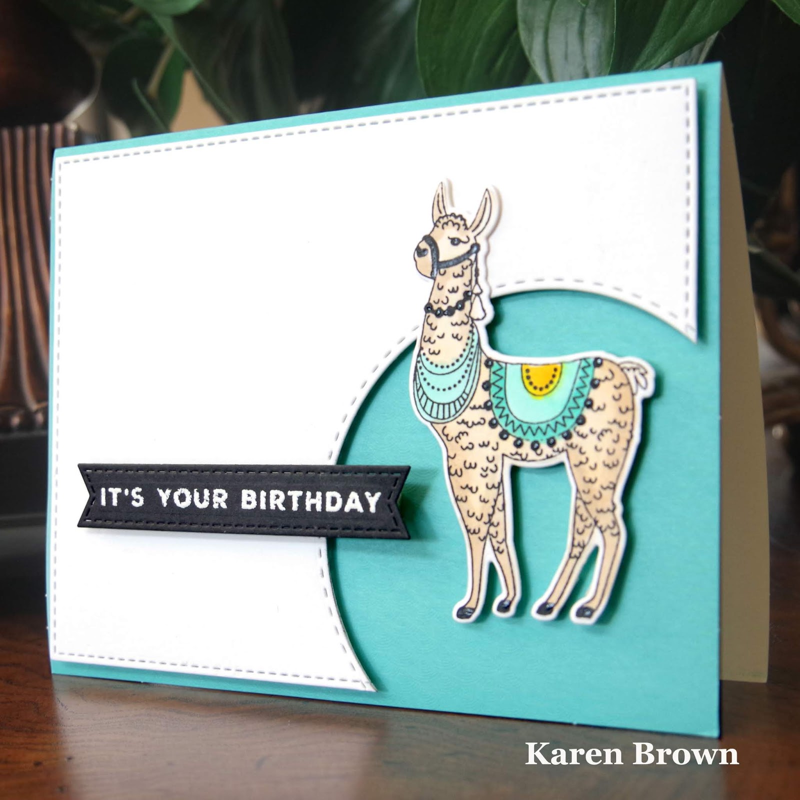 In my family, boys/men enjoy humorous animal cards so that was my starting point. I stamped, Copic colored and die cut the animals and greenery. Next I die cut the sentiment and then assembled the scene with foam tape. I thought the monkey swinging from the sentiment was fun.