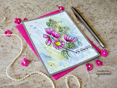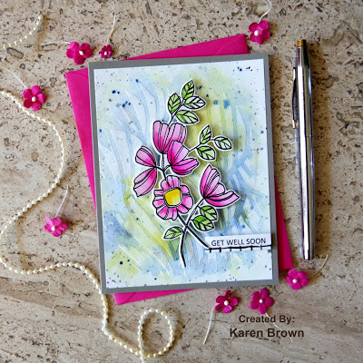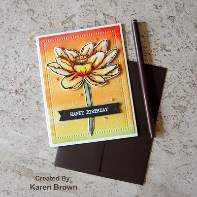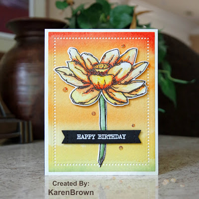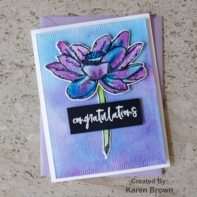 I wanted a coordinating background so I used the same colors that I used to paint the lotus. I taped the watercolor panel to a board to reduce warping, elevated the board and then started painting at the top with a #12 brush. We learned to put darker color at the top and then pull the color down with a damp brush. Keep adding color and then maneuvering the color around with a damp brush. Flip the board, skip an area and then add the third color then pull the color toward with scarlet. Pull color down and push the middle color up. Continue adding layers of color and keep blending. I die cut the lotus, heat embossed a sentiment on cocoa card stock, assembled with foam tape and added some buttercream jewels. I like how bright, intense and cohesive the color palette is. I am very pleased with this card.