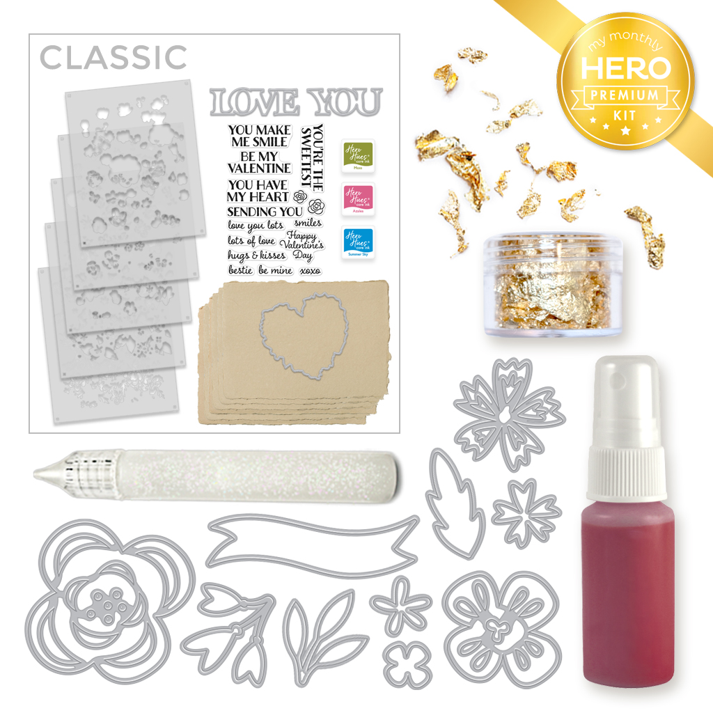 I fell in love with Hero Arts Antique Bee LetterPress set. I find the plates to be both elegant and whimsical and thought they would make lovely sympathy cards. I used the gorgeous camel watercolor paper that came in my January MMH Classic kit but Hero Arts Handmade Watercolor Paper would be beautiful too. I stamped on my Message Strips Sentiment in coordinating ink. I trimmed my panel down with the pretty Square Scallop Infinity Die and popped onto a card base made from Cup O’ Joe cardstock.