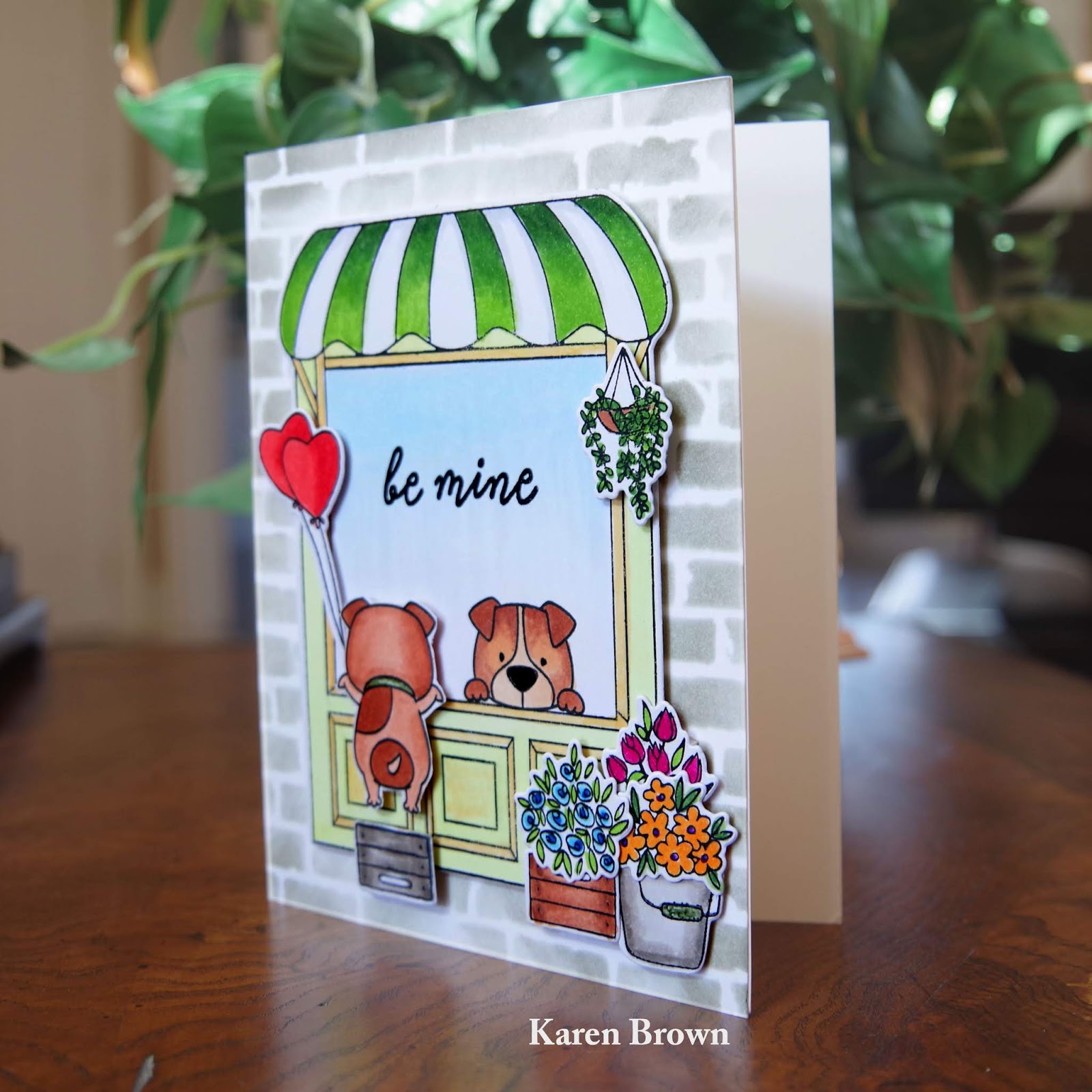 I wanted to create a valentine that would appeal to men and thought a cute \”scene\” card featuring two dogs trying to get together in a florist shop would be fun. One dog is peering out over the window sill as the other dog is using a crate to try and climb inside.